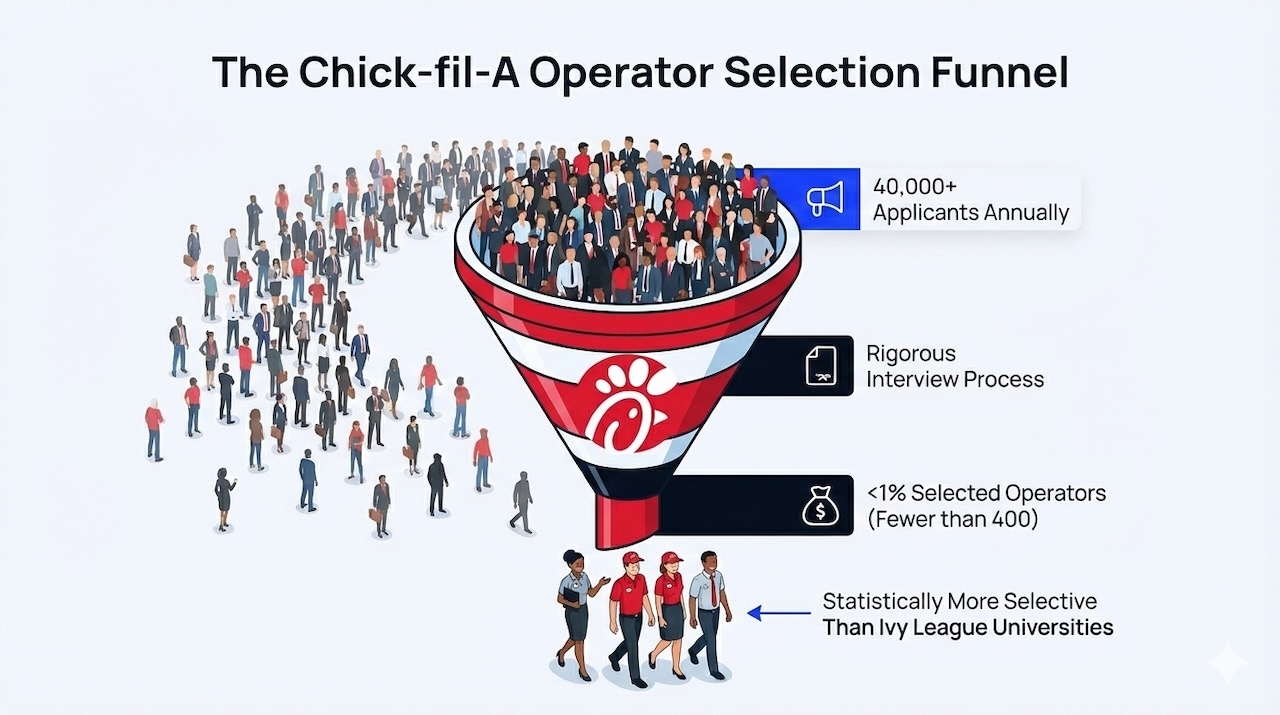 Despite the low Chick-fil-A franchise cost, securing an operator position is extremely difficult. Chick-fil-A receives over 40,000 applications annually but selects fewer than 400 new operators, resulting in an acceptance rate of less than 1%—statistically more selective than Ivy League universities. As part of the selection process, candidates must participate in multiple interviews, both online and in person, to demonstrate their suitability and commitment.