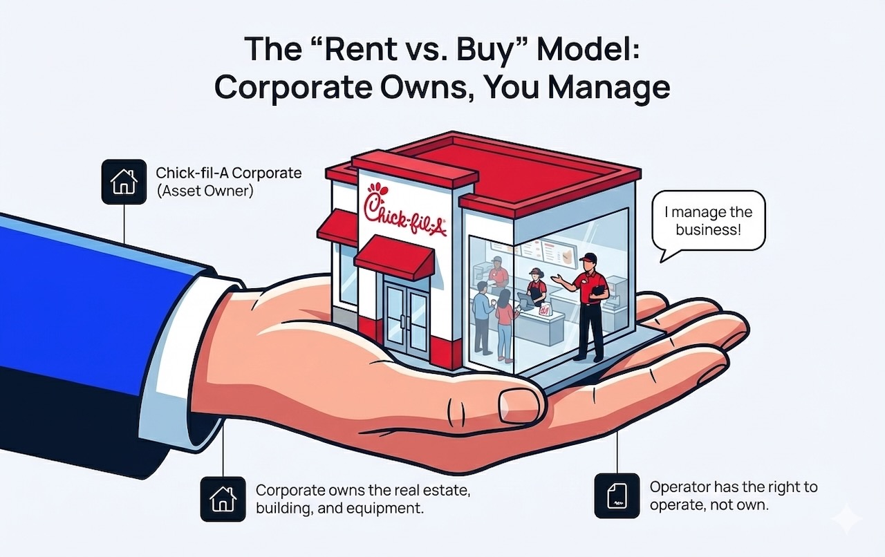 Chick-fil-A operators do not own the franchise, building, or equipment. They have the right to operate the restaurant and share in its profits, but Chick-fil-A corporate retains ownership of all physical assets. Operators cannot sell their position or pass it to heirs.